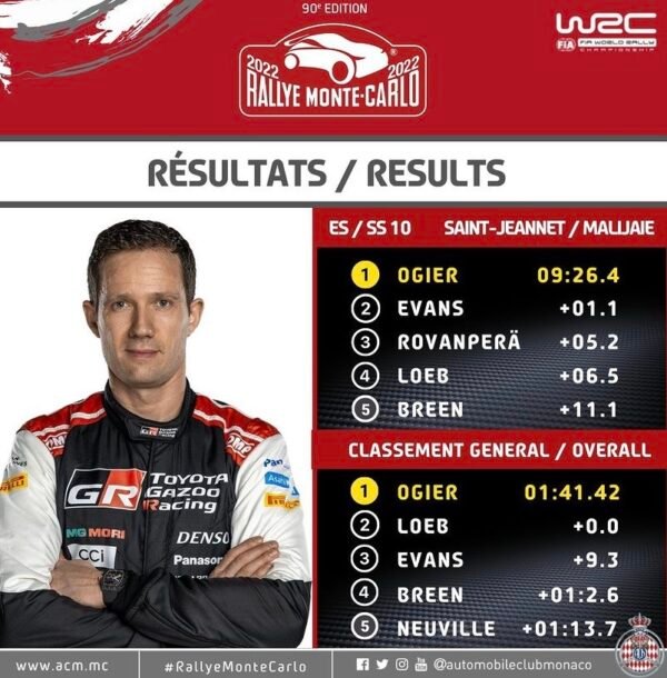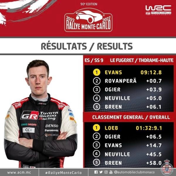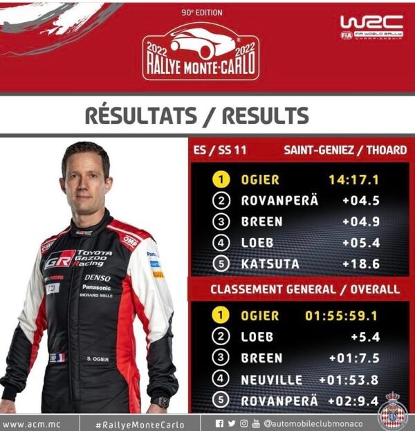 Ainsi aprés les deux premiéres spéciales, l’ES 9 et l’ES 10, ils se sont retrouvés, ex æquo à égalité de temps, avant la suivante, troisième et dernière de la matinée, le premier des deux passages ce jour dans celle de Saint Geniez -Thoard et ses 20, 79 kilomètres et où les pilotes ont enfin trouvés une spéciale enneigée !Et, à l’arrivée, c’est le pilote de la Toyota qui a été le plus vite, en 14’17.2, précédant son adversaire de l’équipe Ford M Sport, Sébastien Loeb, crédité de 14′ 22.5 soit 5 secondes 4, et seulement quatrième, car également devancé par une autre Toyota de Kalle Rovenpera, avec 14’21 6 et une autre Ford Puma Rally1 de Craig Breen avec 14’22 !Au regroupement à la mi journée, le pilote de la Toyota Yaris Rally1, devance donc maintenant au classement général provisoire, de 5 secondes 4, celle de l’autre Seb, Sébastien Loeb. Suivent Breen avec la Ford Puma Rally1 à 1’07.5, puis Neuville avec la Hyundai i20 N Rally1 à 1’43.8, suivi de Rovanperä avec une autre Toyota GR Yaris Rally1, à 2’09.4L’ancien Champion du monde, sacré en 2019, l’Estonien Ott Tänak pointe encore plusloin,au volant de sa Hyundai i20 N Rally1, à 3’05.7A noter, la sortie de route pour Elfyn Evans au volant de sa Toyota, le seul jusqu’alors à tenter de suivre le rythme des deux Français et qui a répétitivement tout perdu dans un virage !