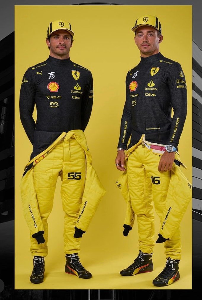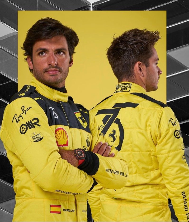 Du jaune sera présent sur les monoplaces, leurs capots moteur et les numéros de course. Concernant les deux pilotes, Charles Leclerc et Carlos Sainz, ils porteront eux une combinaison et un casque jaune.