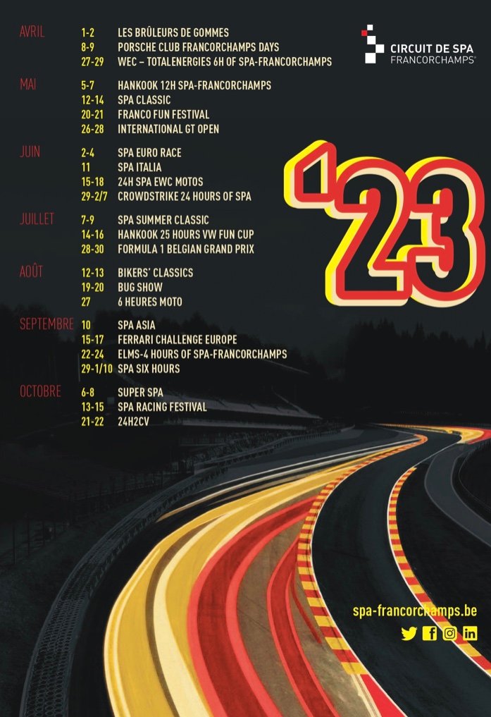 Un bref survol du calendrier mis en place pour l’année prochaine, indique que la nouvelle saison 2023 débutera comme c’est devenu la tradition, au début du mois d’avril avec LES BRÛLEURS DE GOMMES, une organisation toujours haute en couleurs.Quant aux différents Championnats mondiaux comme le GP de F1 fin juillet et non plus fin aout, le Mondial d’endurance WEC fin avril, ou d’autres épreuves d’endurance comme les prestigieuses 24 HEURES DE SPA fin juillet ou l’ELMS fin septembre, elles feront à nouveau partie du programme.Et les amateurs de plus en plus nombreux d’épreuves historiques, comme le SPA CLASSIC, le SPA SUMMER CLASSIC ou encore les SPA SIX HOURS, ne seront pas en reste, tandis que les 25 HOURS VW FUN CUP, les 24 HEURES 2 CV ou encore les 12 HEURES DE SPA-FRANCORCHAMPS, complèteront l’offre de course d’endurance bien fourni, sans oublier l’INTERNATIONAL GT OPEN, les SPA EURO RACES, le SPA RACING FESTIVAL ou encore le PORSCHE CLUB FRANCOR-CHAMPS DAYS, les SPA ITALIA et ASIA SUPER SPA et les FRANCO FUN FESTIVAL devraient également réjouir fans d’épreuves de marques.Après deux années d’absence le circuit Ardennais retrouvera également le BUG SHOW ainsi que le FERRARI CHALLENGE EUROPE mais par contre n’accueillera plus la manche BENELUX du Championnat du Monde de Rallycross.Et les deux roues n’ont pas été oubliées non plus, avec les BIKERS’ CLASSICS, à la mi-août tandis que la deuxième édition de la manche Belge du Championnat Mondial d’Endurance FIM, les 24 Heures de SPA EWC motos, auront lieu à la mi-juin, alors que les 6 HEURES MOTOS sont programmées fin août.En outre et hors compétition, la piste du Circuit de Spa-Francorchamps, offre aux fans de sports moteurs, une multitudes de journées événementielles et de Trackdays en piste accessibles à tous du 16 mars au 14 novembre. Manfred GIETPhotos : Publiracing Agency ]]>