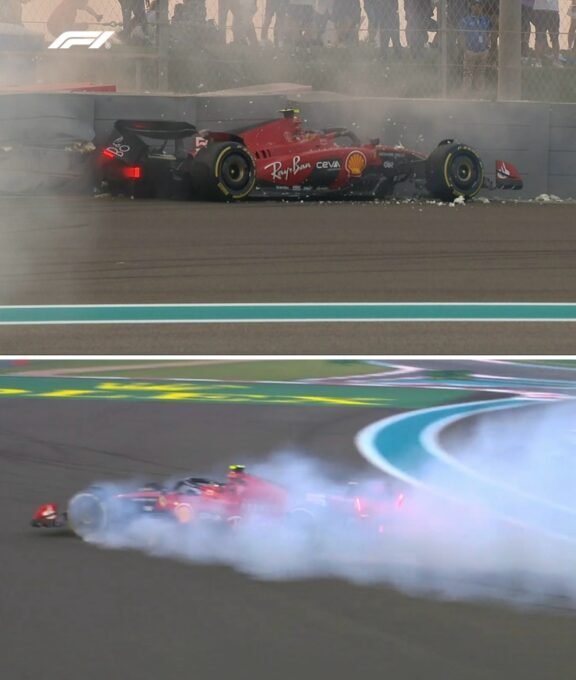 Du coup sa monoplace SF23 a effectué un tête à, queue complet puis la voiture a ensuite glissé vers l’extérieur, heurtant violemment les barrières de protection avec son côté droit !Tout s’est passé rapidement, car Carlos Sainz Jr, n’a rien pu faire vu la vitesse élevée et l’impact a été décidément violent…