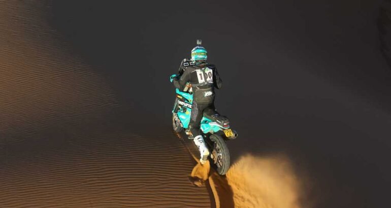 TOMECEK EN SOLO[/caption] Du coup ces messieurs n’essorent plus vraiment la poignée de gaz… Et perdent même la tête de course, au km 319, l’Anglais Hopskitt a repris le pouvoir, il ne lâche jamais le mec, il emmène même Lucci et Jensen devant les deux vedettes ! Sacrés angliches…Il faut dire que Botturi et Ullevalseter l’ont bien aidé en se trompant, et comme ils roulent en semble sans se quitter, ils se sont perdus tous les deux,!Voilà comment le cher Lyndon gagne cette spéciale!En revanche problème pour la moto No 173, l’Allemand Kay Horsch, grosse chute, pilote un peu sonné, qui a été évacué en hélico médical. A priori il s’agit juste d’une commotion, mais sur ce type d’accident les médecins sont toujours méfiants sur des conséquences tardives, indécelables sur place. Dans les hôpitaux, les IRM sont très performantes sur ce genre de contrôle, cela se fait très souvent en MotoGP où des pilotes sont envoyés pour contrôle IRM même s’ils se sont relevés totalement conscients d’une chute en général violente. Bravo à ces médecins du rallye raid incroyablement dévoués, rapides et efficaces. [caption id="attachment_316945" align="aligncenter" width="600"]