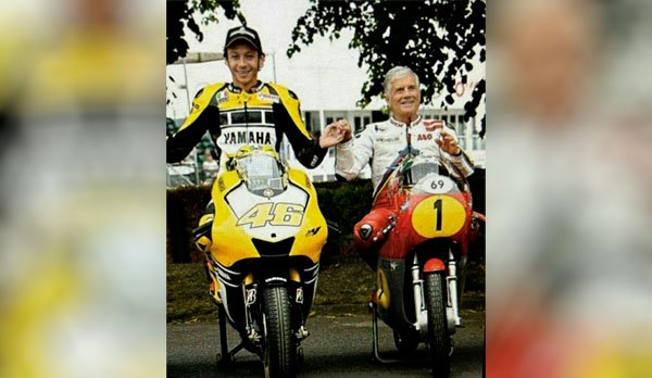 (6 en Moto GP-1 en 500cc, 1 en 250cc et 1 en 125cc) avec 115 victoires en GP (76 en Moto GP- 13 en 500cc, 14 en 250cc et 12 en 125cc)A sa droite, le ‘ROI Ago, Giacomo Agostini: 15 titres de Champion du monde (8 en 500cc et 7 en 350cc) avec122 victoires en GP (68 en 500cc, 54 en 350cc et 1 en 750cc).Les deux pilotes les plus titrés de toute l’histoire des rands Prix Motos vitesse!Giacomo Agostini a remporté sa toute 1ère victoire en GP à l’occasion du Grand Prix d’Allemagne au Nürburgring dans la catégorie des 350cc au guidon d’une MV Agusta le 25 avril 1965La même année, Ago s’impose également pour la première fois en 500cc lors du GP de Finlande, à Imatra le 22 aout 1965 sur MV Agusta.Valentino Rossi, lui a décroché son 1er succès en GP en 125cc au Grand Prix de Tchécoslovaquie le 18 aout 1996 sur une Aprilia. En 250cc au GP des Pays-Bas, à Assen le 27 juin 1998 sur Aprilia. En 500cc au British GP, le 9 juillet 2000 à Donington sur Honda. Et en Moto GP au Japon, à Suzuka le 7 avril en 2002, au guidon d’une Honda. Gianpietro CERVONIAPhotos : MOTO GP ]]>
