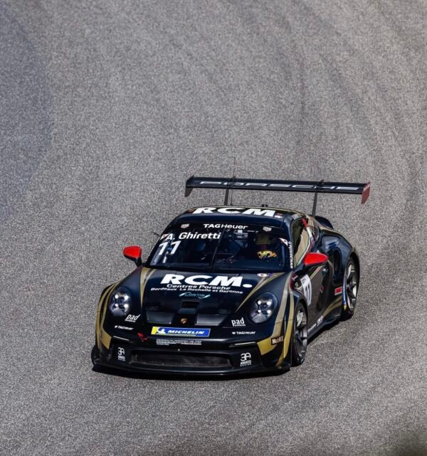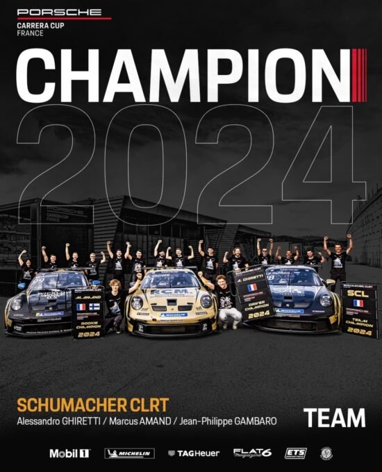 Le lendemain samedi matin, Alessandro Ghiretti débarquait sur la grille de départ … avec une nouvelle livrée entièrement dorée !Dans la nuit, l’équipe Schumacher CLRT avait troquée l’habituelle couleur noire de la voiture du N°11 pour célébrer le titre.Le Junior PCCF (Porsche Carrera Cup France) 2021 avait donc à cœur de briller et d’emmener sa voiture jusqu’à la plus haute marche du podium de cette ultime épreuve 2024.Une nouvelle fois, il prenait un très bon départ pour conserver le commandement du peloton.La bataille était intense juste derrière entre les deux mêmes animateurs de la veille, Marcus Amand et Louis Perrot.Les positions s’échangeaient à plusieurs reprises, avec quelques petits contacts, mais l’ancien ‘simracer, prenait encore le meilleur sur son jeune équipier.Ce nouveau triplé confirmait la supériorité du Schumacher CLRT et menait l’équipe de Côme Ledogar jusqu’au titre Teams.
