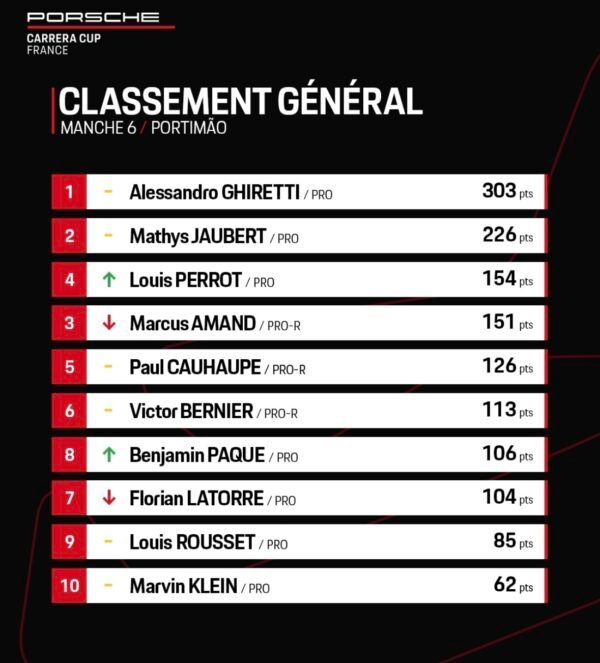 En effet, en s’adjugeant déjà les deux pole positions, il s’assurait les points manquants pour être sacré et ce avant les deux ultimes courses du calendrier 2024 !Pour autant, le ‘job n’était pas terminé. Jamais rassasié, Alessandro Ghiretti souhaitait effectivement terminer avec la manière … tout simplement en gagnant.En Course 1, le poleman s’élançait parfaitement pour prendre les rênes du peloton. Auteur d’un départ plus difficile après une magnifique qualification, Marcus Amand, autre pilote du Schumacher CLRT, se faisait passer par Louis Perrot, lui aussi membre de cette équipe CLRT Schumacher.Ce dernier collait aux basques du leader en espérant remporter sa première course dans le Championnat.Impérial à l’avant, Alessandro Ghiretti ne craquait pas. Et finalement les trois partenaires montaient ensemble sur le podium pour offrir un joli triplé au Schumacher CLRT.Mathys Jaubert du Martinet by Alméras et Paul Cauhaupé, encore un pilote CLRT Schumacher, complétaient le Top-5.Chez les ‘rookies, la victoire de Marcus Amand lui permettait de faire un grand pas vers l’obtention du titre 2024.Paul Cauhaupé finissait deuxième, et Victor Bernier de l’écurie Martinet by Alméras, troisième, lui.
