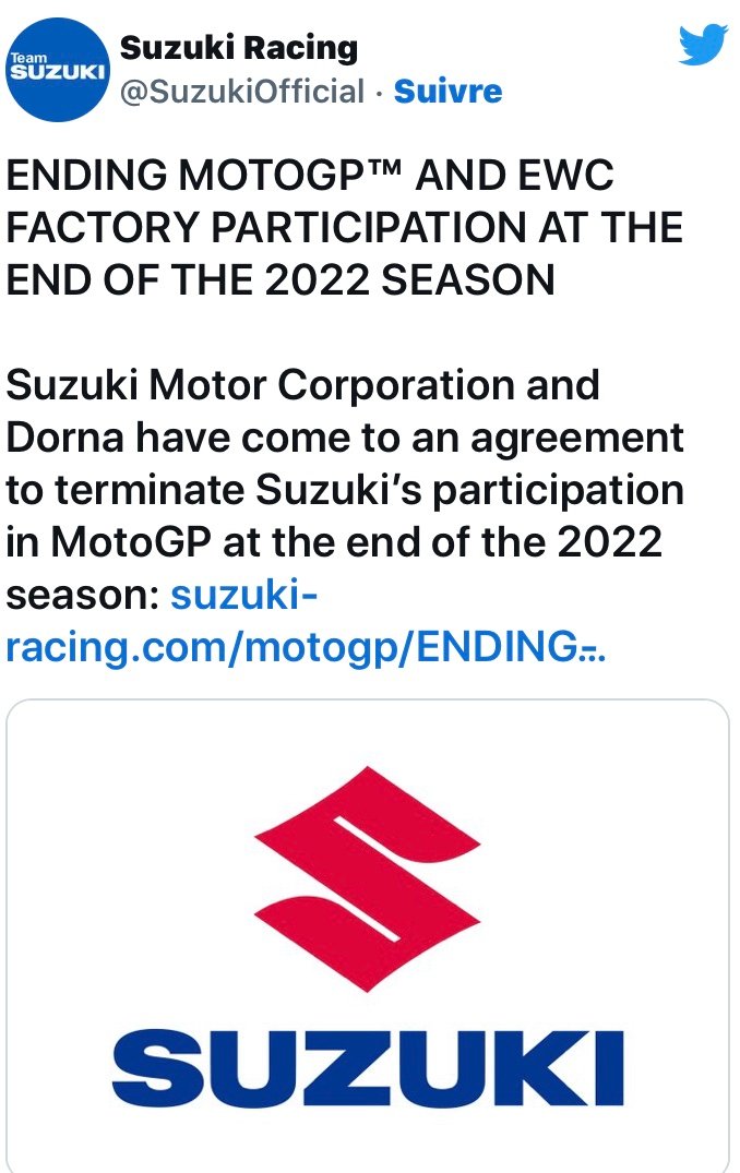 Suzuki Motor Corporation et Dorna sont parvenus à un accord pour mettre fin à la participation de Suzuki au MotoGP à la fin de la saison 2022. Suzuki mettra également fin à sa participation usine au Championnat du Monde d’Endurance (EWC) à l’issue de la saison 2022.