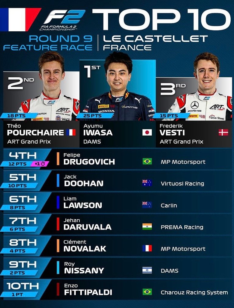 LE CLASSEMENT GÉNÉRAL PROVISOIRE DE LA F21.Drugovich : 173 points– 2.Pourchaire : 134 – 3.Sargeant 118; 4.Daruvala 94; 5.Lawson 79; 6.Doohan 78; 7.Fittipaldi 76; 8.Vesti 75; 9.Iwasa 72; 10.Armstrong 69]]>