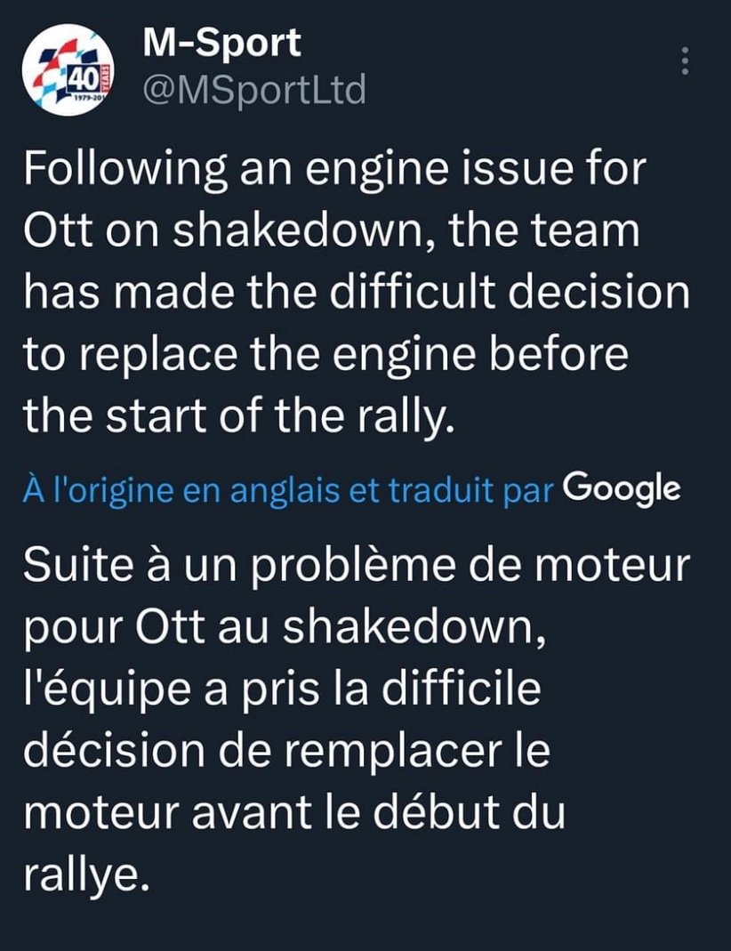 Il n’est pas réparable, du coup avec le changement du moteur, il va écoper d’une pénalité automatique de cinq minutes avant de prendre le départ ce jeudi soi« Nous n’avons pas d’autre choix que de changer le moteur, ce que le règlement nous permet de faire, mais cela veut dire que nous aurons une pénalité avant même le départ », a expliqué Richard Millener, directeur de l’équipe.Avant d’indiquer:« C’est un début de rallye vraiment frustrant, peut-être le pire que nous aurions pu connaître, mais c’est la situation dans laquelle nous nous trouvons. Cela va sérieusement nous handicaper dès le départ, vraiment, mais nous devons changer d’approche maintenant. Nous ne pouvons pas revenir en arrière, donc le but est désormais d’essayer de sauver tout ce que nous pouvons du week-end. De toute évidence, Ott et Martin sont les plus déçus. Nous apprécions pleinement le pays dans lequel nous nous trouvons, leur rallye à domicile, ainsi que les attentes et le soutien des fans locaux. »De son côté, le Finlandaise Kalle Rovanperä évitait les problèmes et affichait ses intentions en signant le meilleur temps du shakedown organisé sur une spéciale de 4,08 km.Le tenant du titre débute ce huitième rendez-vous du calendrier en grand favori avec son avance de quarante-et-un points au championnat et ses succès lors des deux dernières éditions du Rallye d’Estonie.Au volant de sa Toyota GR Yaris Rally1, Kalle Rovanperä devançait Thierry Neuville (Hyundai i20 N Rally1) pour 1”2. Esapekka Lappi (Hyundai i20 N Rally1) complétait le trio de tête. Claude JULIANPhotos / WRC – TEAM ]]>