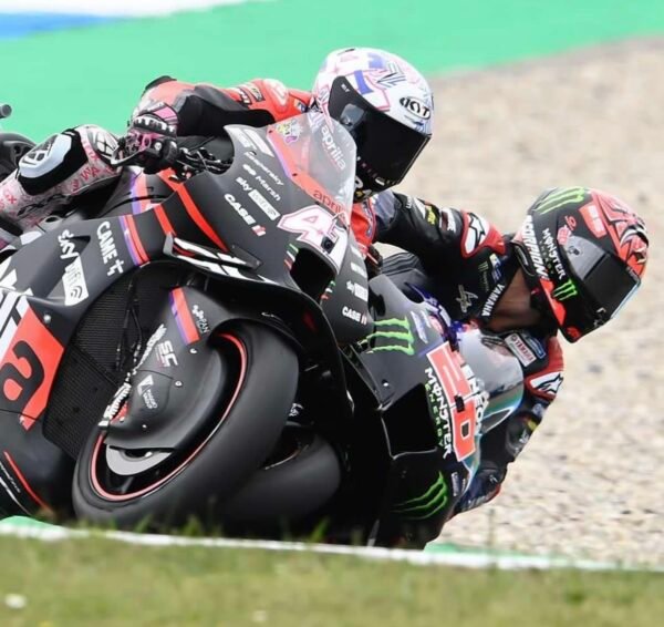 Le Portugais pointe en effet quatrième devant Marc Márquez, avec la plus rapide des deux Ducati du Gresini Racing, qui fait son grand retour en Q2.Le N°93 se classe juste devant Enea Bastianini qui pilote lui la seconde Ducati Lenovo officielle ainsi que le leader du Championnat du Monde, l’Espagnol Jorge Martín avec sa Ducati du Prima Pramac Racing, qui a montré des signes de fébrilité avec notamment un passage dans le bac à gravier… DOMMAGE POUR QUARTARARO PASSÉ TOUT PRÉS…