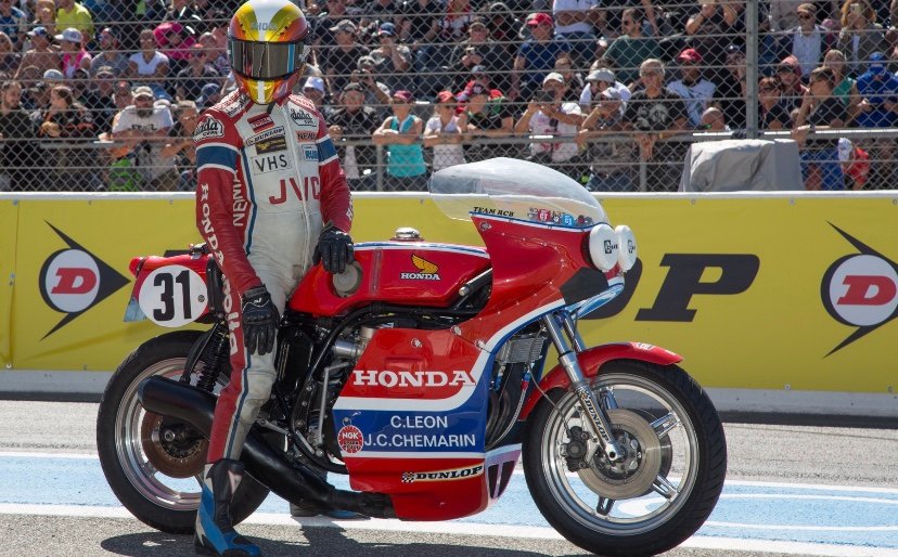 Jean-Claude CHEMARIN – Photo : Michel PICARD[/caption] Comment ne pas avoir une pensée émue pour tous ceux qui ont porté haut le bol un jour et qui nous ont quitté depuis, emportés par cette passion dévorante tels Christian Léon donc mais aussi Michel Rougerie, Georges Godier, Jean Lafond, Bruno Bonhuil, Yasumoto Nagaï, Thierry Tchernine, Steve Hislop, Anthony Delhalle…Le bruit assourdissant des 4 cylindres chauffait l’ambiance et les cœurs battaient la chamade en échos. Gérard Debrock était déjà casqué, un heaume encore facilement identifiable, remis au goût d’une époque où un design faisait toute la carrière, donc l’identité de son pilote . [caption id="attachment_408650" align="aligncenter" width="791"]
