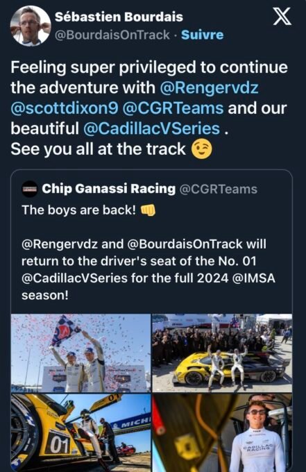 Mike O’Gara, le directeur des opérations au Chip Ganassi Racing, le Team Américain qui aligne la Cadillac V-Series.R N°01 en IMSA et la Cadillac V-Series.R N°2 dans le Championnat du Monde d’Endurance WEC de la FIA, confie :« Nous avons eu un certain succès avec la Cadillac V-Series.R tout au long de la saison IMSA 2023, mais nous en attendons encore plus en 2024. Nous sommes heureux que Sébastien, Renger et Scott soient à nouveau dans la 01 l’année prochaine et que nous puissions bâtir sur la base de 2023 et ainsi poursuivre nos apprentissages ensemble » Et il ajoute encore :« Nous avons prouvé que la voiture était fiable, puisque nos deux Cadillac ont terminé leur première course les Rolex 24 2023 à Daytona. Nous avons ensuite mené beaucoup de tours lors de nombreuses courses l’an dernier, mais pas toujours ceux qui comptaient. Nous profitons de l’intersaison pour nous aguerrir encore plus et appuyer très fort sur le bouton de réinitialisation, afin que nous puissions attaquer 2024 ensemble, plus compétitifs ».