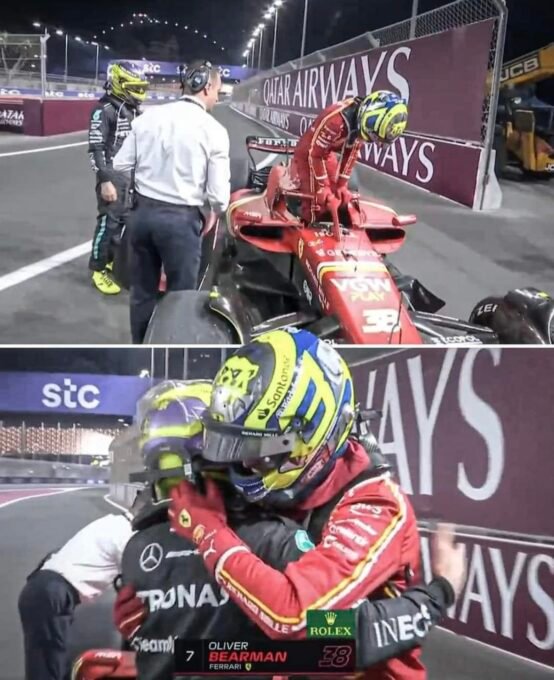 Le respect du taulier Lewis Hamilton. À l’arrivée, il attend Oliver Bearman pour le féliciter .[/caption] Ensuite ? Agréable surprise avec la très belle septième place du débutant, le ‘rookie de Maranello, l’espoir Anglais qui passe septième sous le damier et se permet et s’offre le luxe s’il en, est de précéder tout de même et la McLaren de son compatriote et déjà très expérimenté Lando Norris et aussi et surtout, un autre sujet Britannique… le multiple Champion du monde et pilote Mercedes Lewis Hamilton… seulement neuvième !Excusez du peu !!! Oliver Bearman marquant d’entrée déjà ses premiers points en F1. Le Top 10 étant complété par une Haas en net regain de forme, celle de l’Allemand Nico Hülkenberg