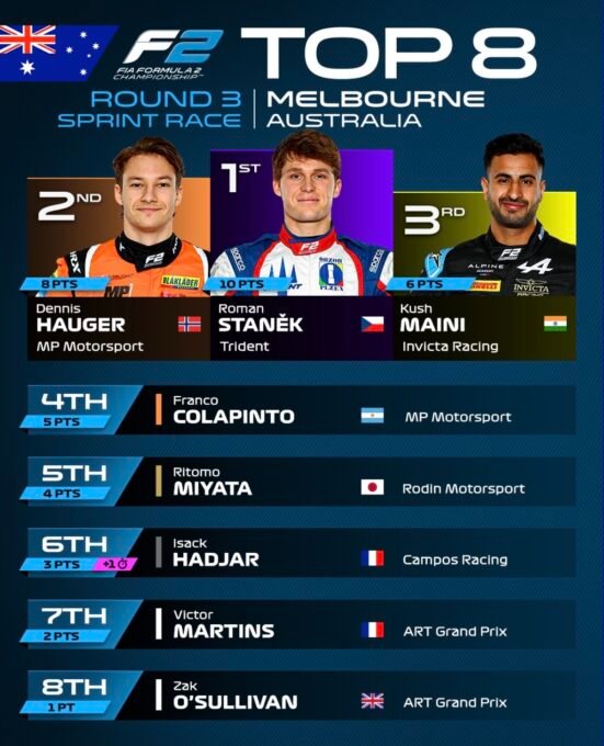 Après la conclusion de la 1ére des deux épreuves de Melbourne, la Course ‘Sprint, plusieurs pilotes ont reçu des pénalités d’après-course.Ainsi le jeune espoir Français Isack Hadjar – le vainqueur de cette premiére manche – quia écopé d’une pénalité de 10 secondes après que le pilote du Campos Racing ait provoqué une collision, impliquant son propre coéquipier, Josep María Martí et Gabriel Bortoleto d’Invicta Racing, au départ de la course.Les commissaires se sont entretenus avec les trois pilotes impliqués et ont examiné les preuves vidéo avant de déterminer que le tricolore s’était déplacé considérablement vers la droite pour se retrouver contre la voiture de Roman Stanek devant lui, sans se rendre compte que Martí avait déjà sa voiture à ses côtés !Ce mouvement a alors du coup contraint Martí à se déplacer et déporter vers la droite pour éviter le choc et, par conséquent, il est entré en contact avec Bortoleto, ce qui a amené à une deuxième collision.Les commissaires sportifs ont donc – vidéo à l’appui – estimé et considéré qu’Isack Hadjar était principalement le responsable et ils lui ont infligé une pénalité de temps de 10 secondes.