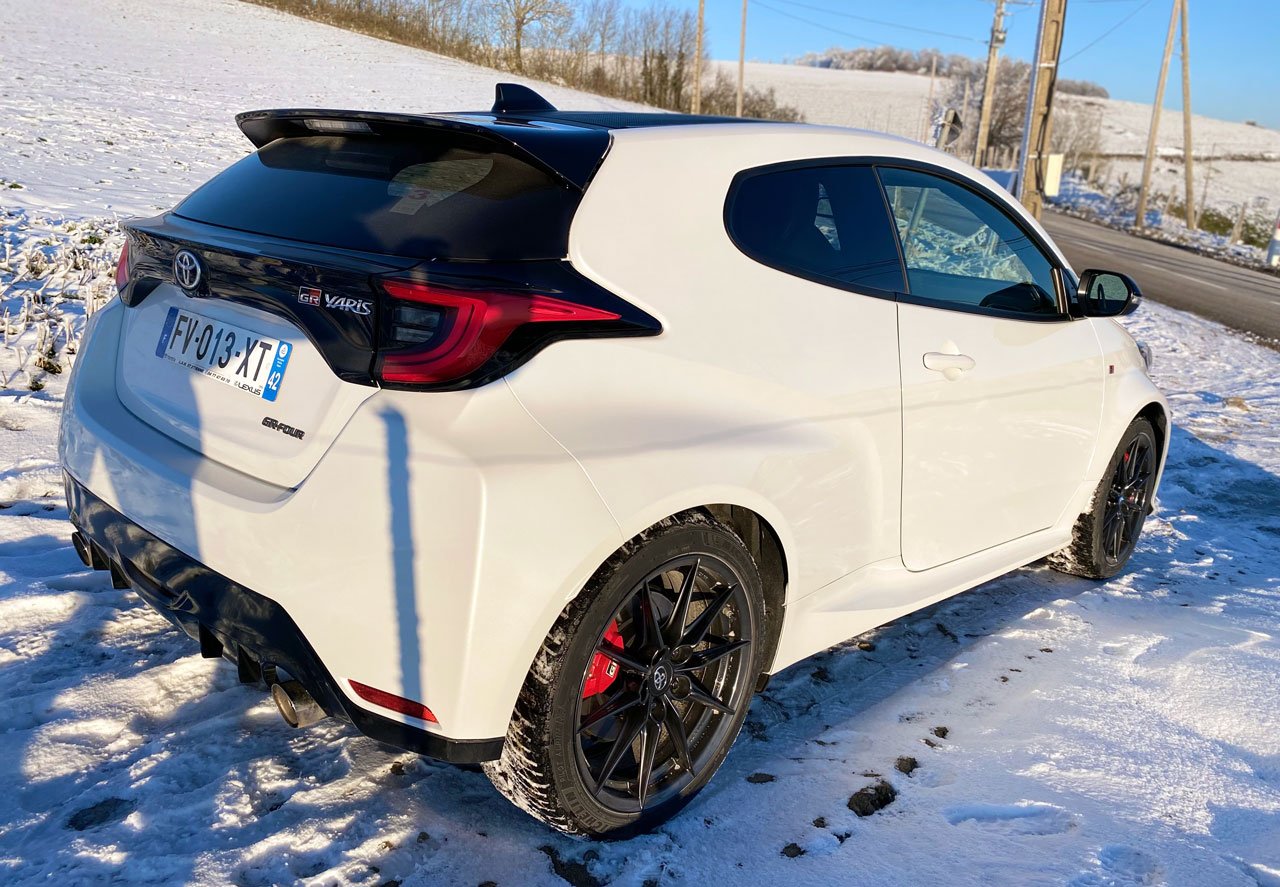 Ce modèle de cet Yaris GR, se décline en deux versions : Pack Premium & Track.La « Track » est doté d’un excellent châssis – plus rigide – et de suspensions GR Circuit, à double triangulation, ainsi que d’un différentiel Torsen à glissement limité. Je trouve que la différence est grande entre les deux versions et j’estime que la « Track » répond vraiment à l’attente sur un choix d’auto si radicale.Je ne m’attarderai pas sur le confort et la partie multimédia du Pack Premium… Affichage tête haute, avertisseur d’angles mort et de circulation arrière, système Audi JBL, éclairage d’ambiance intérieur ou encore radars de stationnement avant et arrière.Sur les routes froides, verglacées et enneigés de cols entourant Saint-Etienne, mon essai prend place dans les conditions de rêve pour la GR. Le système GR Four 4 roues motrices, dévoile tout son potentiel et la compacte est rivée au bitume. Souvenez-vous de son héritage et de la mythique Célica GT Four, des années 80-90, qui à l’époque avait fait les belles années des rallyes mondiaux, avec à la clé des titres de Championnes du monde! Sacres obtenus par les rallymen, le Français Didier Auriol et Finlandais Juha Kankkunen!