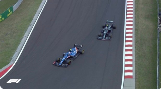 Une seule voiture, celle de Lewis Hamilton, s’alignait finalement sur la grille avec les pneumatiques intermédiaires, Esteban et Fernando optant pour les slicks, imités par le reste du plateau.Les deux voitures ont évité tout contact au redémarrage et Esteban a immédiatement pris la tête de la course alors que Lewis Hamilton … s’arrêtait, lui, pour passer les slicks !Le Français s’installait très rapidement dans son rythme, talonné par l’Aston Martin de Sebastian Vettel. Puis, l’Allemand était appelé aux stands un tour plus tôt qu’Esteban, qui évitait à son retour en piste, l’undercut et conservait ainsi la tête, grâce à un arrêt parfait de l’équipe Alpine.
