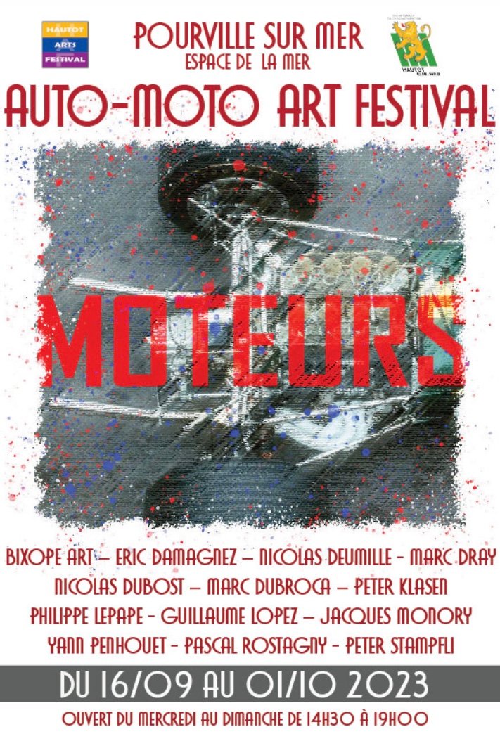 Du samedi 16 septembre au dimanche 1er octobre 2023, l’Espace de la Mer à Pourville sur Mer prés de Dieppe en Seine Maritime, accueillera ‘MOTEURS, le 1er Auto Moto Art Festival regroupant 13 artistes – peintres, sculpteurs et photographes – ayant fait de l’automobile et de la moto, leur source d’inspiration principale.A l’initiative de deux amis de longue date, Jérôme Leclerc, journaliste automobile, et Pascal Rostagny, organisateur de raids motocyclistes, ce festival original est organisé par l’Association Hautot Arts Festival, avec le partenariat de la municipalité d’Hautot sur Mer.