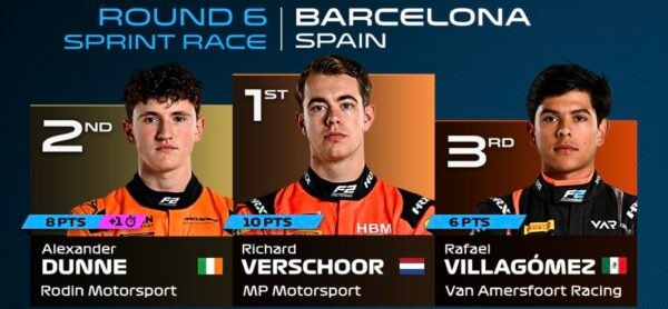 Richard Verschoor, grâce à une ‘stratégie inspirée pour tenter de remonter dans le peloton, a finalement remporté ce samedi 31 mai, la manche ‘Sprint de Catalunya.Le pilote Néerllandais du MP Motorsport a en effet sacrément profité d’une intervention tardive de la voiture de sécurité pour rentrer à son stand et chausser les pneus tendres, pour ensuite les utiliser à son avantage pour remporter une deuxième victoire cette saison.Verschoor a résisté à Alexander Dunne, le pilote du Rodin Motorsport, l’ancienne équipe Carlin, incroyablement second après s’être pourtant – suite à ses deux pénalités de dix et trois places – élancé du fin fond de la grille en dix-neuvième position tandis que Rafael Villagómez, fait encore plus fort car remonté lui, de la… vingt-deuxième et dernière place sur la grille, qui termine à une inespérée – même pas en rêve – troisième place, pour obtenir et décrocher son tout premier podium en Formule 2.Richard, quelle course incroyable et quel arrêt aux stands à la fin. Racontez-nous cette course folle ! Était-ce votre course la plus folle en F2 ?« Je pense que oui. Je suis en F2 depuis un moment, mais celle-ci était vraiment folle. Au début de la course, je m’accrochais. Bien sûr, j’ai calé au départ, ce qui était un peu dommage, mais après l’intervention de la voiture de sécurité, l’équipe a pris la bonne décision. Ils m’ont dit avec beaucoup de confiance de m’arrêter. J’ai suivi leurs conseils et, au final, nous avons fait une superbe course. C’était encore un peu piégeux à la fin, mais Alex était très rapide. Mais je suis vraiment content d’être premier.»À la sortie des stands et à la reprise de la course, pensiez-vous vous retrouver sur la plus haute marche ? « Honnêtement, non. Nous ne connaissions pas la différence entre les pneus tendres et les pneus durs. Je savais que ce serait énorme pendant deux ou trois tours, mais je ne savais pas que ce serait énorme pendant tous les tours que nous avons faits, six, je crois. La différence d’adhérence était tout simplement incroyable, bien supérieure à ce que les gens attendaient, c’est pourquoi je pense que les sept premiers n’ont pas terminé, mais je suis content d’avoir été le premier».
