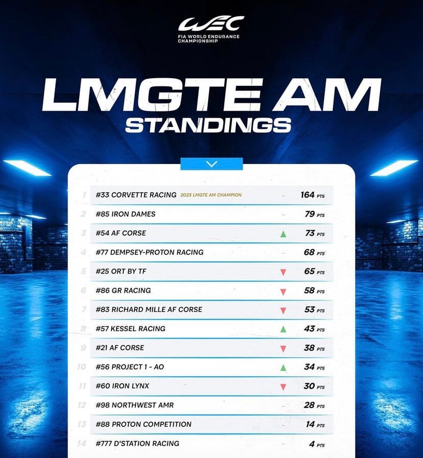 µDans la catégorie LMGTE Am, le suspense est la par contre total, concernant l’identité des équipages qui accompagneront sur le podium de la catégorie, les Champions déjà désignés, le Team US Corvette Racing qui totalise 164 points !A la veille du meeting de Bahreïn, respectivement deux et trois de la catégorie, les très performantes Iron Dames possèdent 79 points et les pilotes de la Ferrari N°54 d’AF Corse, 73 !Mais avec 39 points en jeu à Bahreïn, le podium pourrait bien fort bien être chamboulé à l’issue de l’ultime course de l’histoire de la classe LMGTE Am. Le coup d’envoi de cette épreuve finale du Mondial WEC 2023 sera donné ce jeudi 2 novembre avec les essais libres.La session des qualifications se déroulera ce vendredi 3 novembre à partir de 14h15 (heure française).Le départ des 8 Heures de Bahreïn étant lui donné à midi ce samedi 4 novembre 2023. Gilles GAIGNAULTPhotos/ Antoine CAMBLOR – Thierry COULIBALY – Gilles VITRY