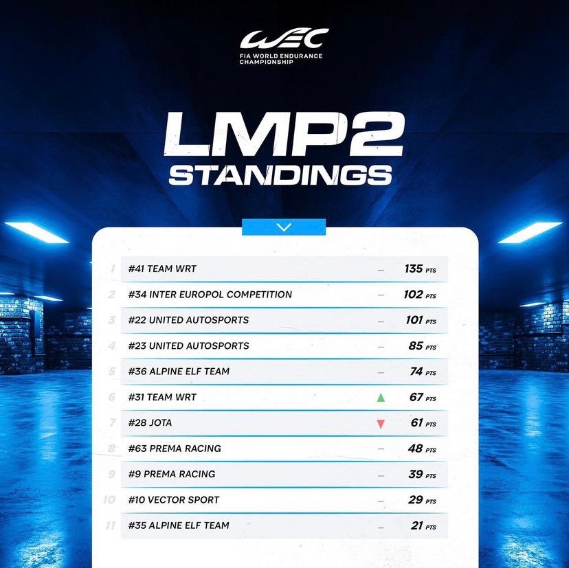 La catégorie LMP2 n’est pas en reste avec la aussi, trois équipes encore en mesure mathématiquement parlant d’être dans le match pour la course au titre !Suite à sa victoire obtenue au Fuji et son exceptionnelle régularité affichée tout au long de la saison 2023, l’Oreca 07 N°41 de l’équipe Belge du WRT de Vincent Vosse avec l’équipage que forme le Portugais Rui Andrade, le Suisse Louis Delétraz et le Polonais Robert Kubica bénéficie d’une confortable avance de 33 points.D’aprés les calculs … une huitième place finale seulement sera suffisante pour que le WRT récupéré son titre acquis en 2021 avec à l’époque, la seconde Oreca 078, la N°31.Séparés actuellement d’un point au classement LMP2, leurs dauphins, les Polonais d’Inter Europol Compétition et l’une des Oreca 07, la N°22 du Team Britannique de Richard Dean, United Autosports devraient lutter pour le titre symbolique de vice-champions de la catégorie.EN LMGTE… TOUT PEUT ARRIVER POUR LE TITRE DE VICE-CHAMPION!!!