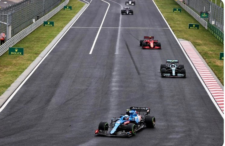 L’ALPINE D’OCON MÈNE DEVANT VETTEL ET LA FERRARI DE SAINZ Jr[/caption] En tête, toujours l’Alpine d’Ocon, devant l’Aston de Vettel, la Ferrari de Sainz Jr, la seconde Alpine d’Alonso et l’Alpha Tauri de Gasly qui complète ce Top 5 provisoire. Suivi de son jeune équipier Japonais Yuki Tsunoda et d’Hamilton qui au fil des tours, gagne place aprés place… [caption id="attachment_367140" align="aligncenter" width="800"]