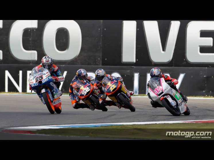 90 000 spectateurs, un circuit qui est dessiné comme un slalom spécial, des chutes par dizaines et de très belles victoires…Vinales, Marquez et Stoner ont été les rois de la journée. Les ROISUne journée d’ailleurs, sans sauce hollandaise, il n’a pas plu, ce qui a donné des combats de pif-paf absolument sublimes.En particulier en Moto3, (photo ci-dessus) où Vinales (25), Kent (52), Cortese (11) et Salom (39) ont été en paquet de bout en bout.