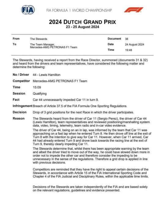 Lewis Hamilton s’est pour sa part, vu infligé une pénalité de trois places pour avoir gêné la Red Bull du Mexicain Sergio Pérez au cours de la première partie des qualifications samedi après-midi sur le circuit de Zandvoort.