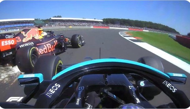 Alors qu’il était en lutte avec Lewis Hamilton pour conserver sa première place dans la ligne droite avant le virage de Copse, le Néerlandais au commandement avant de débouler sur la courbe du circuit à l’extérieur a été touché avec la roue arrière droite de sa Red Bull, par la roue avant gauche de la Mercedes.