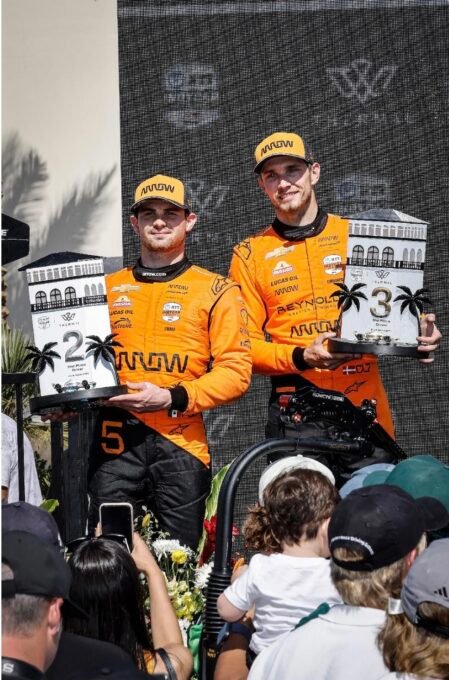 McLaren n’a pas pu rééditer le doublé obtenu un peu plus tôt au Grand Prix de Chine à Shanghai en Formule 1, devant su coup finalement se contenter d’un double podium en Amérique du nord certes, mais avec les seconde et troisième nplace.Une course splendide cependant pour O’Ward et Lundgaard, lesquels n’ont tout simplement rien pu faire face à la stratégie mise en place par le staff du Chip Ganassi !Alex Palou déclarait :« Quel week-end incroyable. Les gars ont fait de l’excellent travail. Gagner les deux premières courses de la saison est incroyable. J’ai une très grande équipe. Ils ont fait tout le travail. »Ensuite classés derrière ce trio, on pointe dans l’ordre, Colton Herta qui conserve sa quatrième place obtenue sur la grille de départ et qui précède le premier des pilotes du Meyer Shank, Felix Rosenqvist, qui finit dans le Top 5.