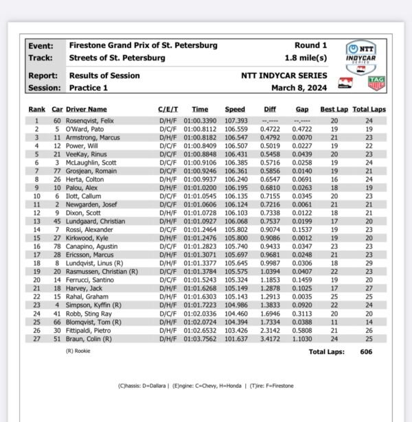 Au volant de sa Dallara-Honda, il devance avec 1’00.3390, le Mexicain Pato O’Ward de l’écurie McLaren, second au volant de sa Dallara Chevrolet avec 1’00.8112 et le Néo-zélandais Marcus Armstrong du Chip Ganassi, troisième avec sa Dallara Honda en 1’00.8182Top 5, pour la Dallara Chevrolet de l’Australien Will Power du Team Penske avec 1’00.8409 et pour le Néerlandais Rinus Veekay, avec la Dallara Chevrolet du Ed Carpenter en 1’00.8848