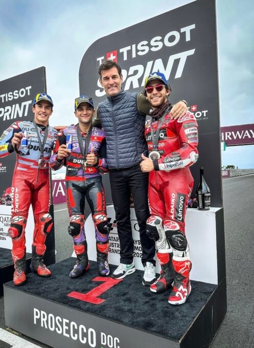 Au terme d’un affrontement marqué par une chute spectaculaire, l’actuel leader du classement général provisoire du Championnat du monde 2024, le pilote Espagnol Jorge Martín de l’écurie Ducati Prima Pramac Racing, s’impose en triomphant devant son compatriote, ancien multiple Champion du monde Marc Márquez qui roule lui chez Ducati Gresini Racing et l’Italien Enea Bastianini, le second pilote ‘ officiel Ducati Lenovo Team. [caption id="attachment_479089" align="aligncenter" width="600"]