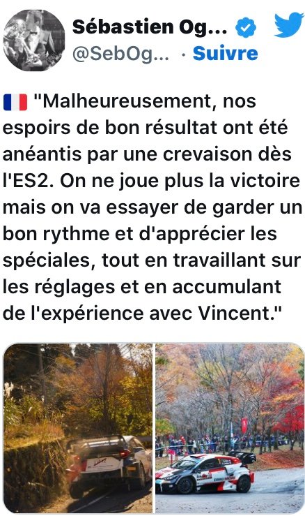 Finalement toujours extrêmement motivé et aprés une sensationnelle remontée, bien que privé du match pour la victoire, le Gapençais s’est accroché rmportznt plusieurs spéciales et il terminer à une plus qu’honorable quatrième place de cette manche Japonaise, se classant au sixième rang du Championnat du monde 2022 et ce après n’avoir disputé seulement que six des treize manches.Comme l’a écrit un de nos confrères, il n’y a que Sébastien Ogier pour oser dire ça !Même des Kings comme Sainz, Kankkunen, ou plus récemment Sébastien Loeb n’auraient jamais osé, parler ainsi, demeurent malgré leurs colères silencieux par crainte de représailles…Ajoutant et précisant:Il serait fort intéressant de faire et de regarder le total des crevaisons cette année et le répertoire par pilote! Claude JULIANPhotos : TEAM