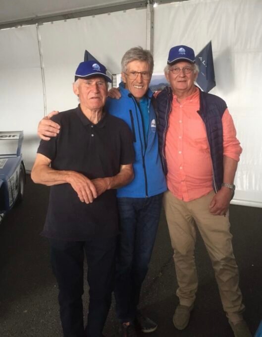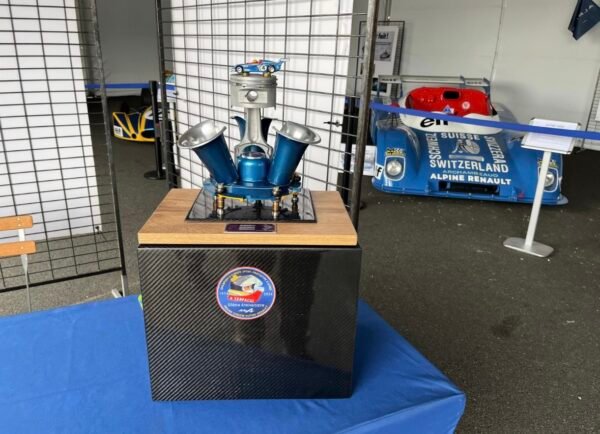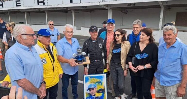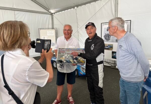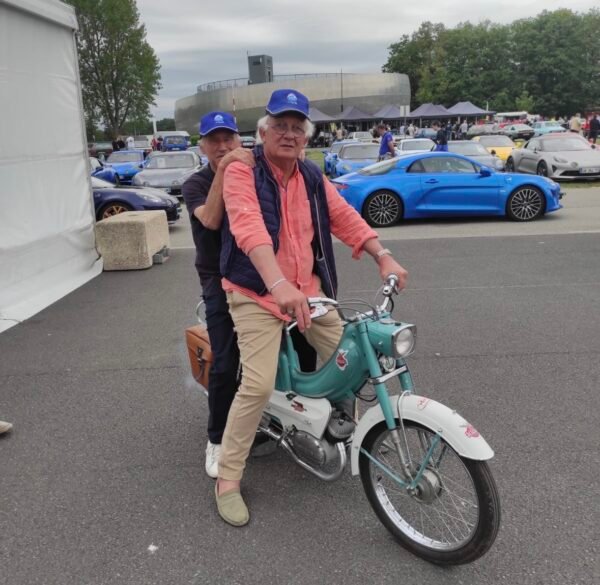 L’ensemble des anciens d’Alpine (mécaniciens-ingénieurs-pilotes) étaient naturellement présents et on pouvait croiser bien des visages connus, pêlemêle, tels l’ancien patron du service-course Alpine Jacques Cheinisse, les ingénieurs Michel Têtu. François Xavier Delfosse, Jean Pierre Boudy, Jacques Bornic et bon nombre des mécaniciens de cette belle époque de fraternité, parmi lesquels donc Michel Mallier et son complice Daniel Champion, lesquels arrivèrent et débarquèrent sur la piste… en mobylette Flandria d’époque, avec leurs blouson d’autrefois pour offrir à Alain, un Trophée réalisé par Michel, à la demande de l’ensemble de l’association des anciens d’Alpine.