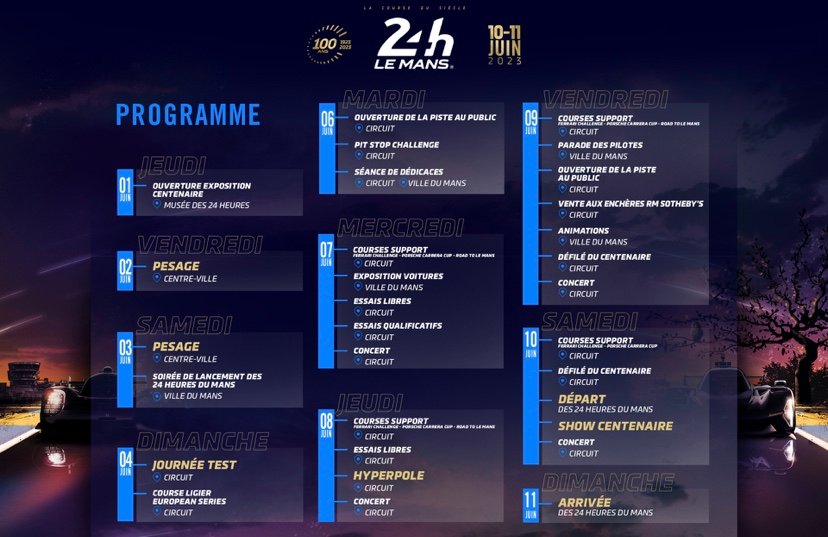 Le jeudi 1er juin, une exposition unique au monde ouvrira ses portes au Musée des 24 Heures du Mans. L’objectif est de réunir plus de 60 voitures ayant gagné ou participé aux 24 Heures du Mans.Le lendemain, vendredi 2 juin, débuteront les traditionnelles vérifications techniques et administratives. Le “Pesage”, installé Place de la République au Mans, constitue l’un des temps forts de la quinzaine. Cet événement continuera le samedi 3 juin, avant une grande soirée de lancement organisée en ville. Cette cérémonie mettra à l’honneur les bénévoles, commissaires de piste et agents des collectivités œuvrant lors des 24 Heures du Mans, notamment lors d’une parade avenue du Général Leclerc.Le dimanche 4 juin, les voitures entreront en piste avec la Journée Test. Pour la première fois, une course support, la Ligier European Series, se déroulera lors de cette journée.Le mardi 6 juin est une journée organisée pour le public. Sur le circuit, s’enchaineront respectivement la visite des stands, séance de dédicaces et pit stop challenge. Cette initiative, reconduite pour la seconde année consécutive, permet de mettre en avant les mécaniciens en les challengeant sur des changements de roues. Une belle mise en lumière pour ces personnes de l’ombre ! En fin d’après-midi, de nombreux pilotes viendront à la rencontre du public en centre-ville pour une séance de dédicaces.Mercredi 7 juin, la compétition reprendra ses droits. Après différentes courses support en matinée (Porsche Carrera Cup, Ferrari Challenge, Road to le Mans), les premiers Essais Libres et Qualificatifs des 24 Heures du Mans prendront place. En parallèle de ces activités en piste, une grande exposition de voitures historiques de prestige débutera en centre-ville du Mans. Enfin, le soir, le premier concert de la semaine se déroulera sur le circuit.Depuis 2020, le jeudi en 2023 le 8 juin, est synonyme d’Hyperpole. Cette séance spectaculaire laissera les 24 concurrents les plus rapides auparavant (8 en Hypercar, 8 en LMP2 et 8 en LMGTE Am) rivaliser sur les 13,626 km du circuit, en pleine recherche de la vitesse pure, et sans contrainte de trafic. Afin de mettre en valeur les pilotes amateurs, cette séance sera réservée aux pilotes Bronze dans la catégorie LMGTE Am.A l’instar du mardi, la journée du vendredi, le 9 juin est destinée aux spectateurs. Après les courses supports en matinée, la célèbre parade des pilotes traversera Le Mans plus tôt que les années précédentes à partir de 14h. La piste sera par la suite ouverte au public. Un moment d’exception pour les spectateurs, qui pourront fouler la piste des 24 Heures du Mans. Une activité accessible à toute personne en moyen de transport doux : à pied, à vélo, en trottinette ou en rollers. Afin de célébrer le Centenaire comme il se doit, un grand défilé prendra place sur la piste en fin d’après-midi. Les plus célèbres voitures ayant participé aux 24 Heures du Mans retrouveront l’asphalte du circuit pour le plus grand bonheur des spectateurs. S’en suivra un concert pour bien clôturer la journée.Le moment tant attendu, le départ des 24 Heures du Mans, se déroulera le samedi 10 juin à 16h. Avant cet instant crucial, de nombreuses animations viendront célébrer le Centenaire : défilé de voitures et de pilotes, présence de la Patrouille de France…Cette journée du samedi se clôturera par le “Show du Centenaire” : un spectacle pyrotechnique et de drones suivis d’un concert exceptionnel.
