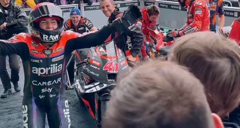 Sous des gouttes de pluie et chaussé en pneus slick, le Catalan a déposé le Champion du monde en titre et actuel leader du Championnat 2023, le pilote officiel Ducati Lenovo, Fransesco ‘Pecco Bagnaia dans le dernier tour de ce Grand Prix de Grande Bretagne pour signer le deuxième succès de sa carrière en Moto GP!