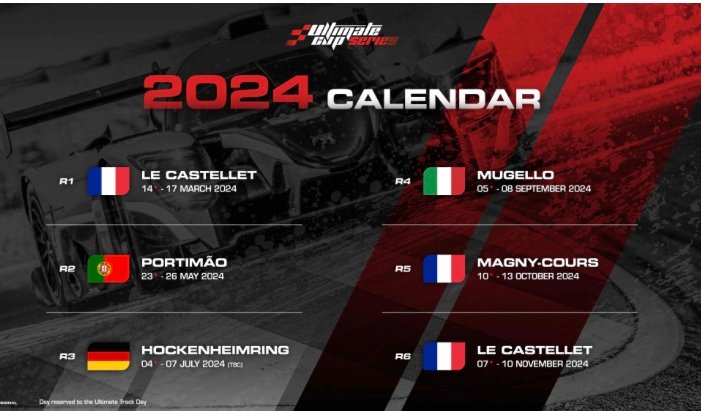 Les responsables de l ’Ultimate Cup viennent de dévoiler et d’annoncer le calendrier pour la saison 2024.Il y aura six rendez-vous dans la série qui offre un mélange varié de catégories, comprenant les formule de monoplaces de FR, celle des tourisme, des grand Tourisme, des GT et des prototypes LMP3 et CN.Le Championnat 2024 débutera le week-end du 17 mars, sur le circuit Français du Paul Ricard au Castellet.Puis, direction l’étranger pour la première des trois épreuves hors de France au sud du Portugal, à Portimao en Algarve.La troisième manche aura lieu à Hockenheim en Allemagne, puis après la pause estivale, les concurrent s se rendront en Italie au Mugello.Les deux dernières courses se dérouleront en France à Magny-Cours et à nouveau au Castellet, le week-end du 10 novembre. François LEROUXPhotos : Davy DELIEN
