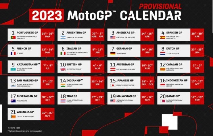 Silverstone sonnera pour sa part la rentrée des classes le 6 août ; l’Autriche étant programmé le 20 août. Montmeló et Misano seront quant à eux disputés à un week-end d’intervalle… Tout commeBuddh en Inde et Motegi. Cette campagne 2023 s’achèvera enfin sur deux triplés : Indonésie – Australie – Thaïlande et Malaisie – Qatar – Valence, épreuve qui fera office de bouquet final le 26 novembre.