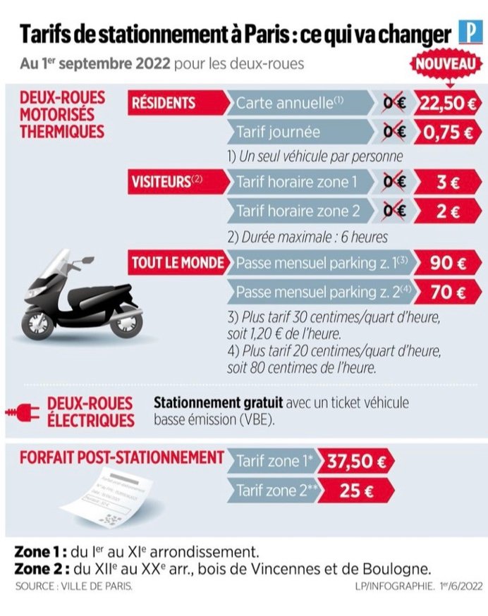 Mais tous les 2 roues ne sont pas concernés. Le paiement devient en faitobligatoire pour les deux-roues motorisés thermiques.Les propriétaires de deux roues électriques toujours d’un stationnement gratuit.