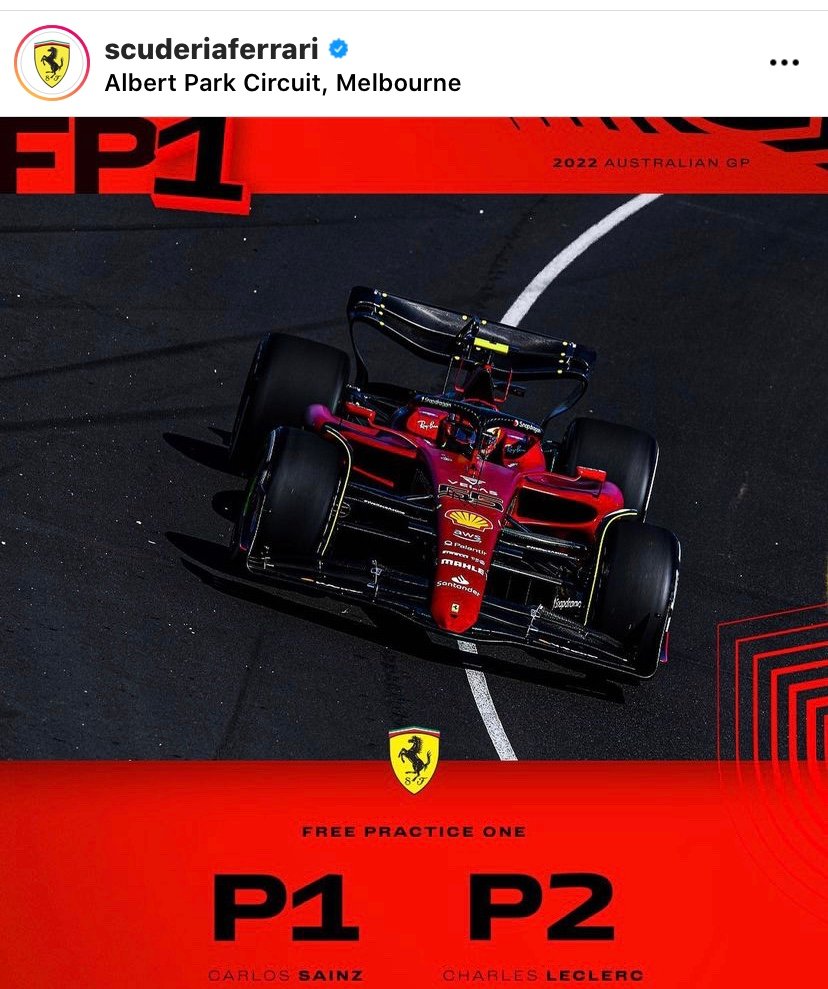La Scuderia Ferrari enchaîne… Ce vendredi lors de la première séance des essais libres à Melbourne, où se déroule ce week-end sur le tracé de l’Albert Park, le Grand Prix d’Australie, troisième manche du Championnat du monde de F1 2022, les deux monoplaces Ferrari, réalisent les deux meilleurs temps, signant le doublé, avec l’Espagnol Carlos Sainz Jr, meilleur chrono, avec 1’19″806 devant le Monégasque Charles Leclerc, second avec 1’20″377 à o.571 tout de même!Top 5 pour le Mexicain Sergio Perez avec la plus rapide des deux Red Bull Honda, troisième à 0.593, en 1’20″399 et qui précède la voiture-sœur du Champion du monde, le Néerlandais Max Verstappen, quatrième lui, a 0.820 en 1’20″626, devant le Britannique Lando Norris, cinq lui avec sa McLaren Mercedes. a 1.072, en 1’20″878Sixième rang pour la première Alpine d’Esteban Ocon, suivi de la Mercedes de Sir Lewis Hamilton.Suivent dans le Top 10, Daniel Ricciardo, Fernando Alonso et Valterri Bottas