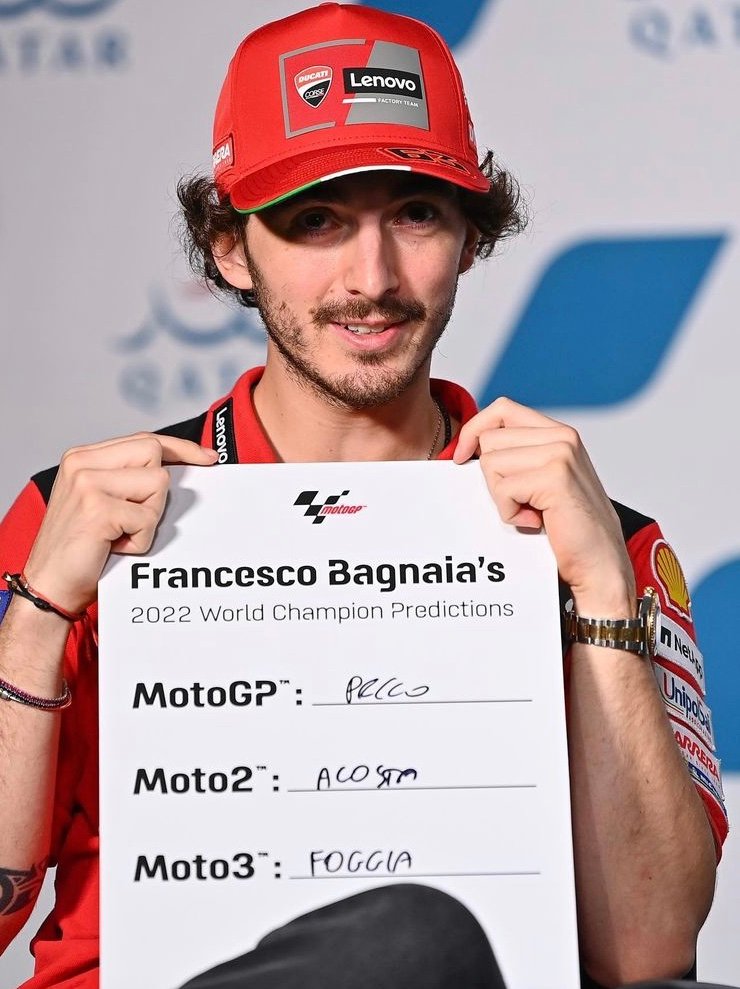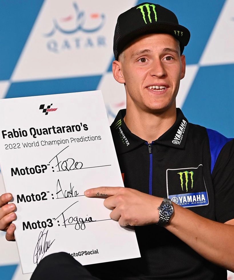 Coup d’envoi ce week-end de la saison 2022 du Championnat du monde du Moto GP, avec la manche inaugurale (Voir lien) qui se déroule sur la piste du circuit de Losail à Doha au Qatar.A la veille des tous premiers essais officiels qui débutent ce vendredi 5 mars, la Dorna le promoteur des GP Motos, s’est amusé et à demander aux pilotes de cette catégorie reine du Moto GP, les plus cités comme favoris pour succéder au Français de l’équipe Yamaha, Fabio Quartararo, de donner leur pronostic que voiciIls ont aussi évoqués les éventuels Champions du Moto 2 et du Moto 3! Alfredo SORIAPhotos : DORNA – MOTO GP [caption id="attachment_386170" align="aligncenter" width="800"]