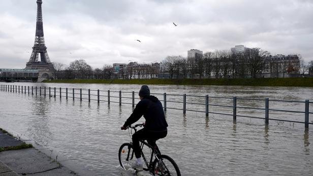 <![CDATA[A man rides a bike in the water as the river Seine overflows, in Paris, on February 1, 2021. (Photo by Ludovic MARIN / AFP)]]>