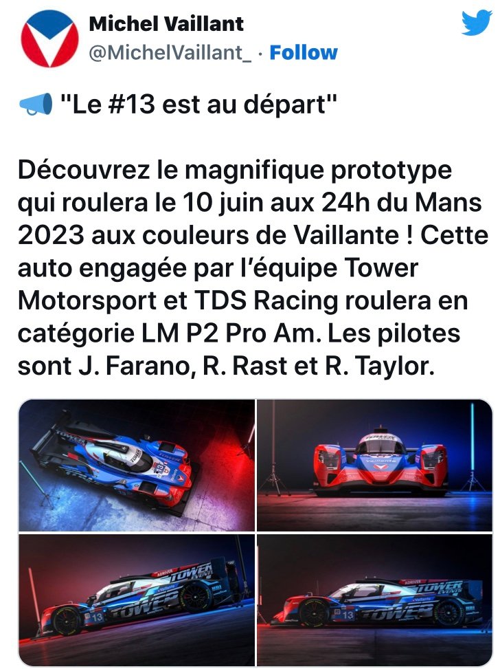 L’édition du Centenaire des 24 Heures du Mans sans les couleurs ‘bleu-blanc-rouge de Vaillante… Impensable ! En juin prochain donc, la voiture qui portera le fameux N°13 – longtemps utilisé par l’écurie d’Yves Courage – sera bien au départ de l’épreuve Sarthoise, engagée par l’équipe Tower Motorsports en partenariat avec la structure Française TDS Racing. [caption id="attachment_430931" align="aligncenter" width="700"]