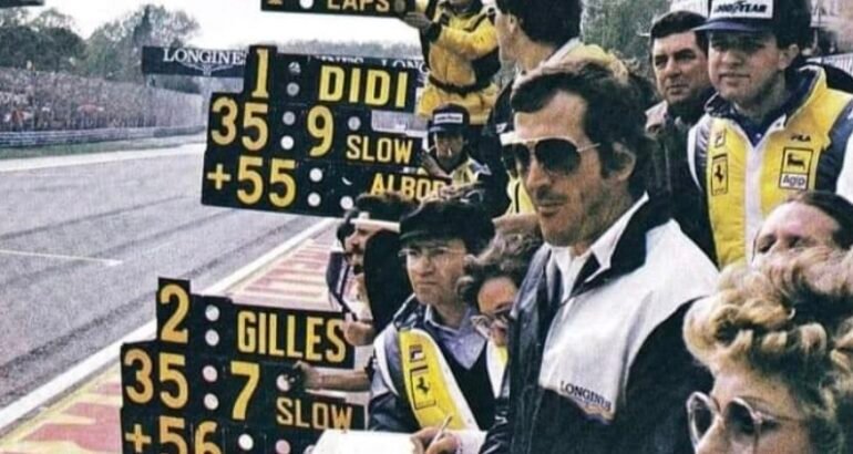 F1 – Gilles VILLENEUVE-Ferrari 126C2, lors du dernier tour avant le drame le samedi 8 mai 1982 à Zolder© Manfred GIET.[/caption] Terrible cette photo qui démontre 39 ans après l’arrivée du Grand Prix de San Marino le dimanche 25 avril 1982, qu’il n’y avait aucune consigne donnée par le stand Ferrari!A l’amorce du dernier des 60 tours de cette épreuve du calendrier 1982 – où la majorité des écuries avaient déclaré forfait, les Teams de la FOCA boycottant cette épreuve pour protester contre la disqualification à l’arrivée du GP du Brésil de la Brabham du Brésilien Nelson Piquet et de la Williams du Finlandais Keke Rosberg – on constate sur ce cliché que Marco Piccinini, le Directeur sportif de la Scuderia, à droite avec la casquette Good Year, le manufacturier à l’époque des Rosso, laissait bien les positions comme indiqué sur le panneau de signalisation de la Scuderia Ferrari, laissant le destin juge du résultat de ce duel fratricide, Didier Pironi se trouvant alors en tête et devançant son coéquipier le Canadien Gilles Villeneuve.A ses côtés sur cette photo figurent également au premier plan, l’ami Jean Campiche, le Chronométreur de la firme Suisse Longines, partenaire de l’équipe de Maranello. Et Valérie Jorquera, l’ingénieur en charge des lubrifiants chez le pétrolier Français ELF. [caption id="attachment_356760" align="aligncenter" width="800"]