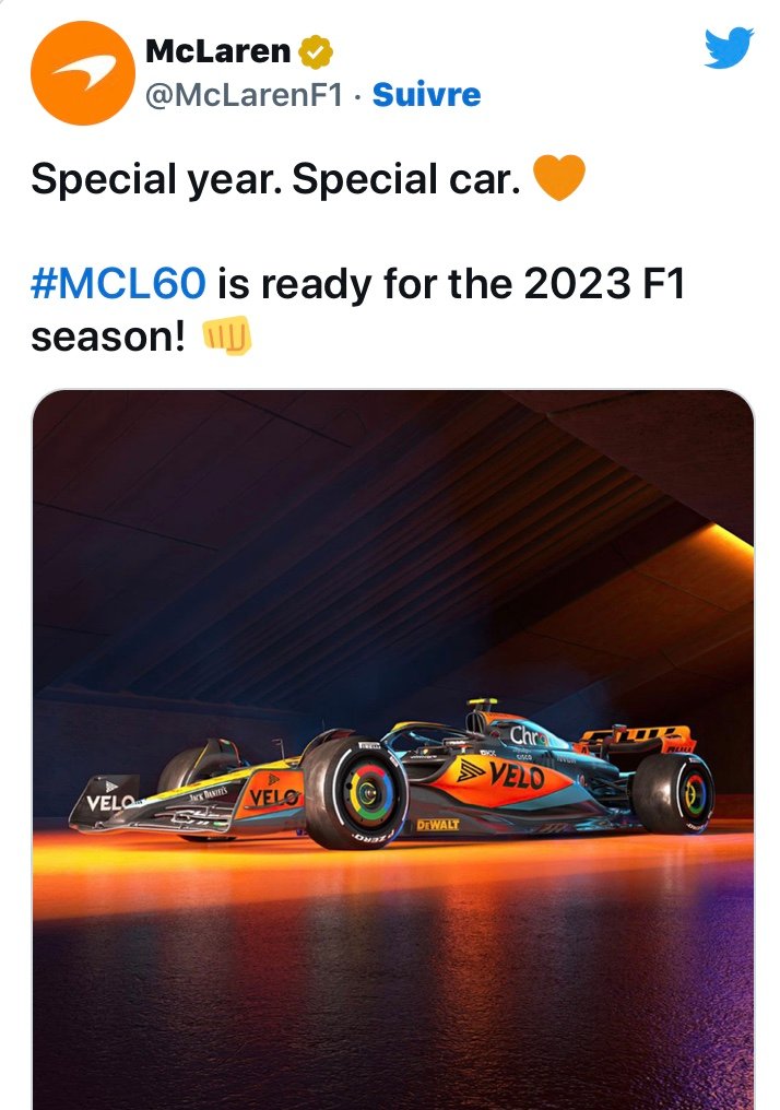 Le Team Britannique presentait ce lundi 13 fevrier a la McLaren Technology (MTC) la monoplace de la saison 2023, la MCL 60…McLaren à à son tour dévoilé sa dernière née la MCL60 au look dynamique pour lancer l’année anniversaire 2023, celle des 60 ans de la firme créée autrefois par le regretté pilote Neo Zélandais, Bruce Mc Laren qui s’est tué lors d’une séance d’essais privés le 2 juin 1970 sur le circuit anglais de Goodwood