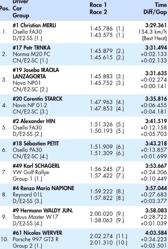 Mais pour la victoire en groupe 2 où la lutte fit rage, entre la BMW Z4 GT3 du Bavarois Joerg Weidinger, la Skoda Fabia du Polonais de Krosno Karol Krupa et la Porsche 997 GT3 R du Français Nicolas Werver.Au terme des deux montées, le multiple Champion de France s’imposait sur la piste de… quelques centièmes et ce devant l’Allemand, avant d’être déclassé pour non- respect d’un drapeau rouge à la dernière montée !