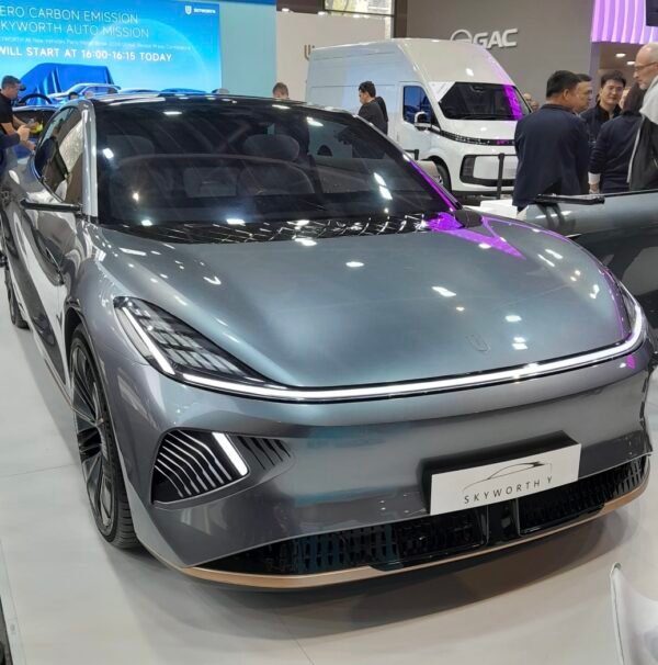 Pour terminer avec une autre note d’humour, encore un modèle d’une autre marque, Skyworth, qui comme BYD, propose une solution en cas de panne, avec un vélo derrière pour continuer sa route..