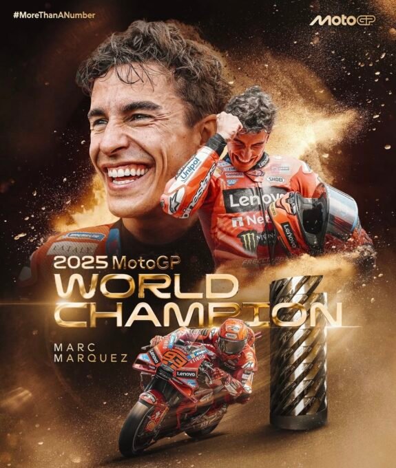 Le pilote Espagnol Marc Marquez au guidon de l’une des deux Ducati Lenovo ‘ Usine, a décroché sur le circuit de Motegi, ce dimanche 28 septembre 2025 au lointain Japon, son septième titre mondial en MotoGP, en terminant deuxième du Grand Prix du Japon remporté par son coéquipier, l’ Italien Francesco ‘Pecco Bagnaia, victorieux lui et qui complète ainsi un week-end de rêve et pour lui et pour l’équipe ‘Officielle Ducati.
