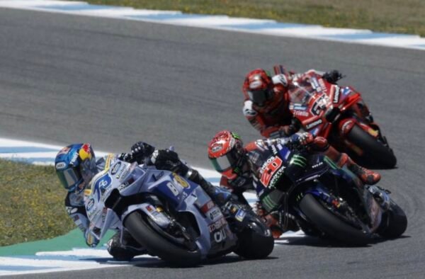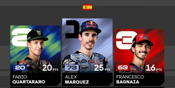 Alex Marquez devant Fabio Quartararo et ‘Pecco Bagnaia[/caption] Ce dimanche 27 avril 2025, sérieux et appliqué malgré l’enjeu il s’est donc enfin imposer, l’emportant devant la Yamaha du Français Fabio Quartararo, lui aussi enfin de retour sur le podium et ‘Pecco Bagnaia, l’autre pilote ‘ officiel Ducati qui complète ce podium inattendu