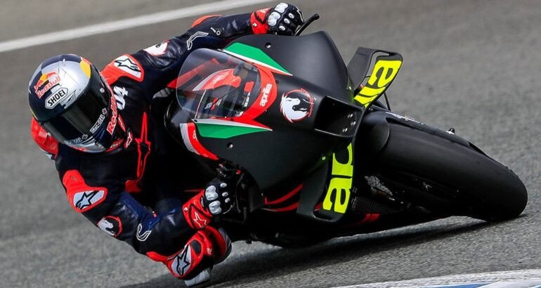 ROSSI SUR L’APRILIA LE CASQUE DOIT VOUS RAPPELER QUELQU’UN[/caption] Si ce week end tout le monde sera focalisé sur le MotoGP de Portimao, avec le retour de Marc Marquez, depuis ce lundi 12 avril, durant trois jours, un autre événement a lieu.C’est à Jerez, en Andalousie, tout au sud de l’Espagne!.Andréa Dovizioso, qui cette année a choisi de courir en motocross régional italien mais rêve de revenir en MotoGP sur une vraie moto, y teste cette fameuse Aprilia.En Italie, cette perspective est presque aussi attendue que l’arrivée de Rossi chez Ducati il y a quelques années… pour deux saisons qui hélas ont été un cauchemar pour le pilote. [caption id="attachment_355856" align="aligncenter" width="800"]