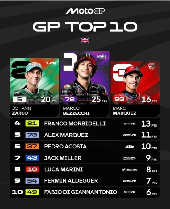 Luca Marini avec la Honda HRC Castrol termine huitième devant Fermín Aldeguer, le ‘rookie de l’écurie Ducati BK8 Gresini Racing MotoGP et Fabio Di Giannantonio, lautre pilote du Ducati Pertamina Enduro VR46 Racing Team de Valentino Rossi, qui complète le Top 10.