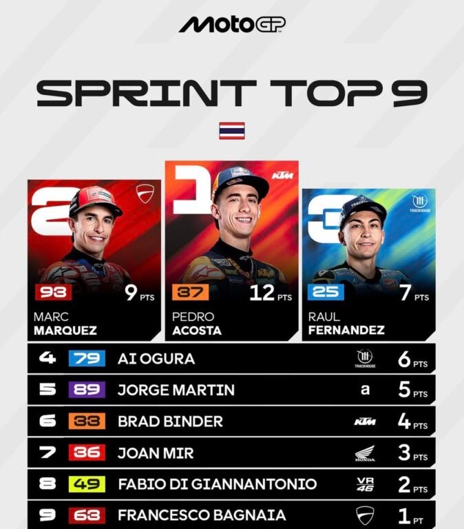 Au terme de 13 tours âprement disputés et … riches en rebondissements, c’est le pilote Espagnol Pedro Acosta de l’écurie Red Bull KTM Factory Racing qui remporte la victoire qui est aussi et surtout sa première course dans l’élite, triomphant devant Marc Márquez et Raúl Fernández.