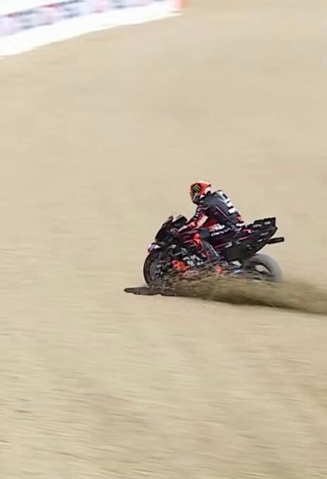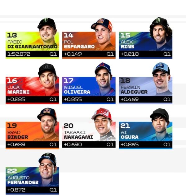 Excellent dans l’exercice des qualifications depuis le début de la saison, l’autre pilote tricolore Fabio Quartararo au guidon de sa Monster Energy Yamaha, s’invite – encore une sacrée belle performance pour l’ancien Champion du monde, titré en 2021 – en première ligne derrière les deux pilotes d’Usine Ducati !Lequeldeclarait:« Mon premier run est mieux que le deuxième, je pense que j’aurais pu faire mieux, mais j’ai été gêné, a déclaré le Français au micro de Canal+. Je signe la première ligne, maintenant, on verra bien pour le rythme de course. Je vais donner mon maximum pour essayer de faire un résultat et de lutter pour le podium. » Bezzecchi a terre. Mir et Raul Fernández impressionnent